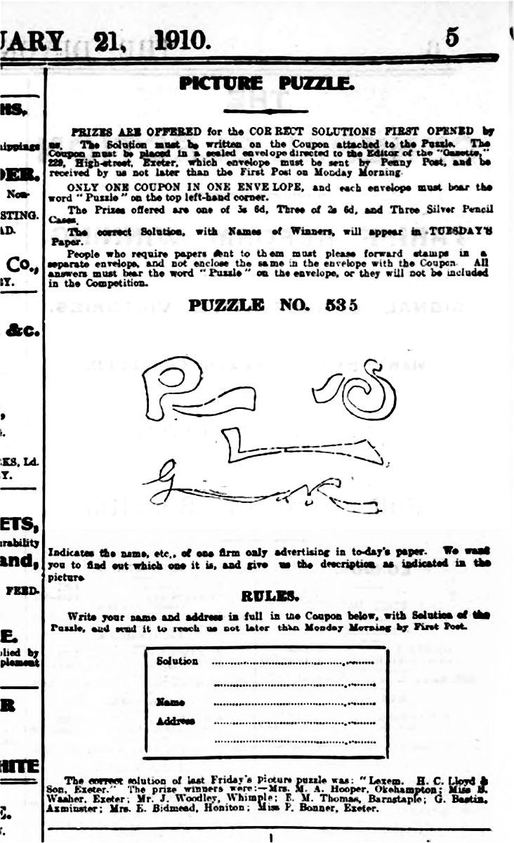 For decades the Company advertised in the Devon & Exeter Gazette. In 1898 the Gazette introduced a Picture Puzzle Competition whereby readers could submit by post to the Offices of the Newspaper (229 High Street, Exeter) their Cut-out Entry Form identifying the answer to the Weekly Picture Puzzle. Entries were to be sent by Penny Post (those were the days!).