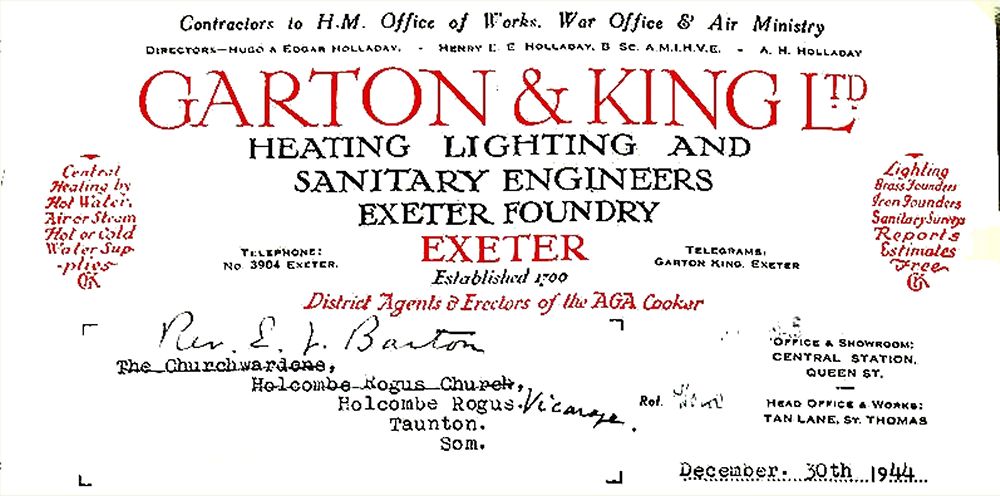 HOWEVER! - anyone reading this article is encouraged, particularly if their work is for an established local business, to keep a watchful eye open. The Company installed heating systems in all manner of locations, many in Devon, and supplied castings for many local authorities as well as performing Aga Installations and selling Kitchen Appliances. Machine Work was performed at Tan Lane - and of course any member of staff would have received documentation from the Company in the form of Payslips and internal mail and even Forms of Apprenticeship and matters relating to their general employment and conditions. All these operations would have involved paperwork of some description, whether in the form of a quote, an advice note, a bill of sale, a Tender Document, or just a run of the mill letter.